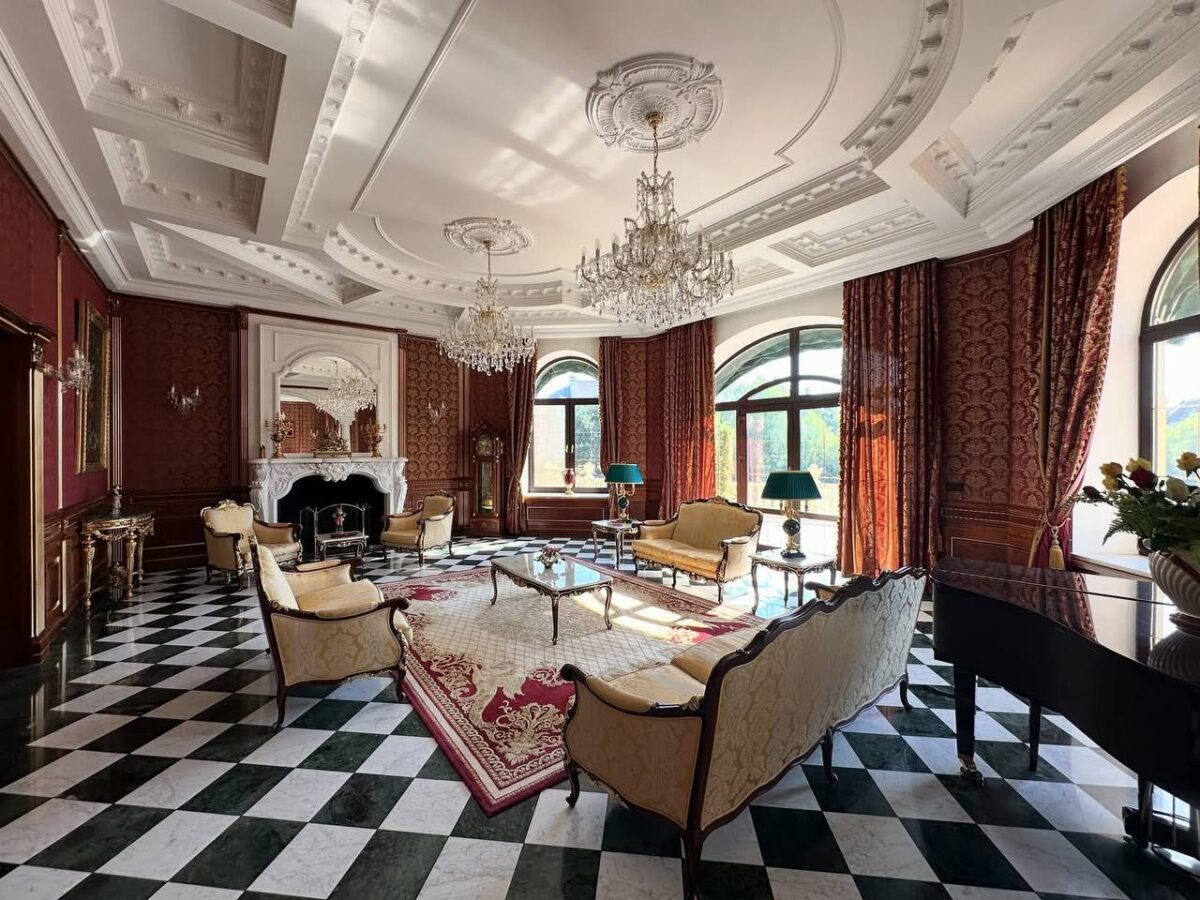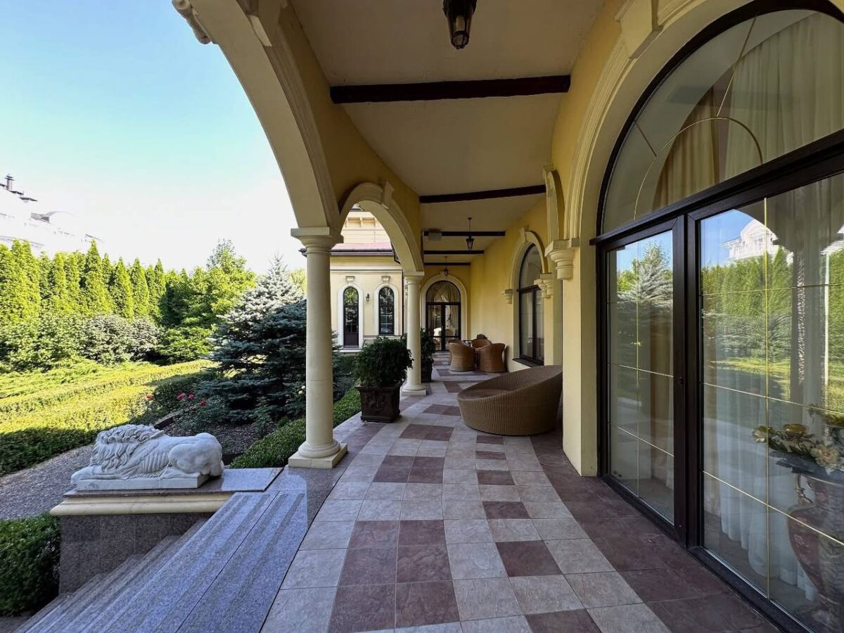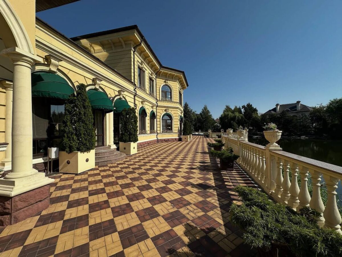 В объявлении указано, что дом расположен в коттеджном городке «Золотые ворота» в Конча-Заспе. Согласно описанию, на продажу выставлен дом площадью 870 квадратных метров на участке 24 сотки с выходом к озеру.